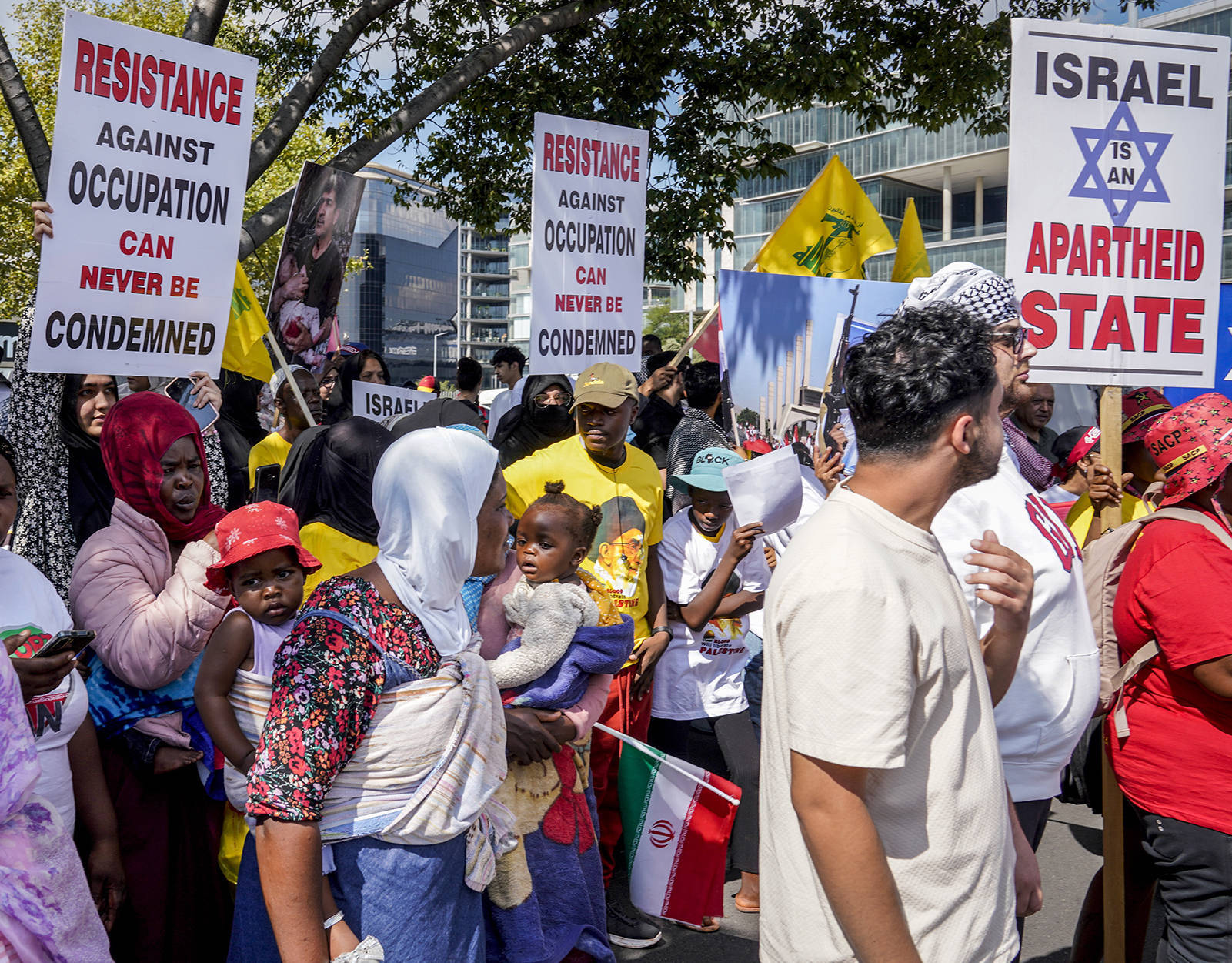 在位于南非约翰内斯堡的好意思国驻约翰内斯堡总领馆外,寰球荟萃抗议好意思以对伊朗动武。