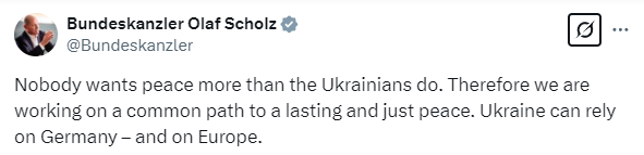 德国总理奥拉夫·朔尔茨说:“莫得东谈主比乌克兰东谈主更渴慕和平,这即是咱们为何共同寻务收尾抓久、公谈和平的旅途,乌克兰不错依靠德国,不错依靠欧洲。”德国联邦议院选举胜选政党定约党涵养东谈主弗里德里希·默茨写谈,“不管顺境如故窘境,咱们齐与乌克兰站在通盘。”